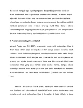 Selain faktor tersebut ada beberapa faktor lain yang diambil kira dalam penyediaan kemudahan bagi murid pendidikan khas di bawah kelolaan KPM adalah. Pendidikan Inklusif Pengetahuan Siswa Guru 10 PENDAHULUAN Pendidikan Inklusif adalah suatu program pendidikan untuk murid berkeperluan pendidikan khas yang dihadiri oleh murid berkeperluan khas bersama-sama dengan murid lain dalam kelas yang sama di sekolah kerajaan atau sekolah bantuan kerajaan Lee. Dalam hal ini proses PdP melibatkan guru dan murid.