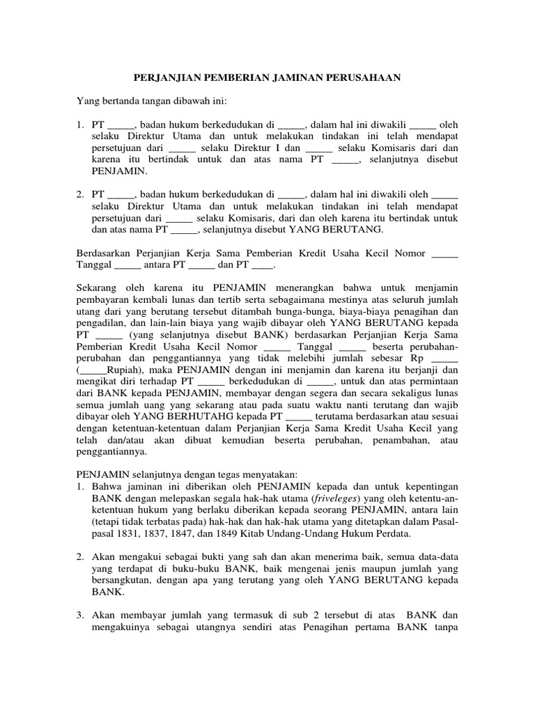 Contoh Surat Perjanjian Pemberian Jaminan Perusahaan Yang Resmi Format Pdf