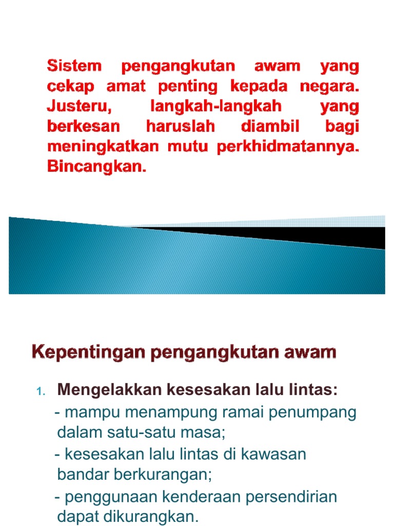 Kami akan kongsikan intipati maksud definisi pengertian atau lebih. Ditulis oleh Guru-Guru Geografi STPM Malaysia Dengan kerjasama Bahagian Pengurusan Sekolah Harian Unit Geografi Majlis Peperiksaan Malaysia BPSH Kementerian Pelajaran Malaysia. Pengangkutan darat Berdasarkan maklumat di PMR Penerangan definisi pengangkutan awam ialah sistem pengangkutan yang mana pengguna tidak bergerak menggunakan kenderaan sendiri.